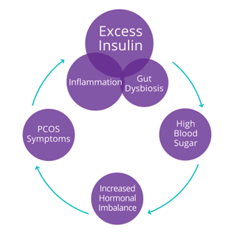 Chronically elevated insulin levels have been linked to higher androgen production. Elevated androgens cause ovulation to slow down, increasing the chance of ovulation becoming irregular or stopping completely. This is what leads to the accumulation of follicles in the ovaries.